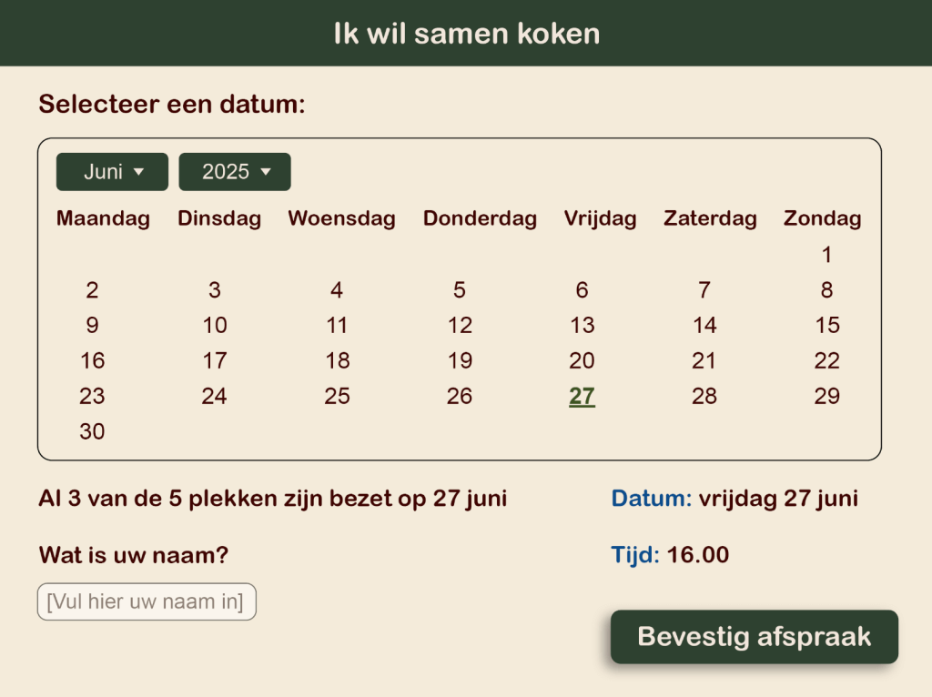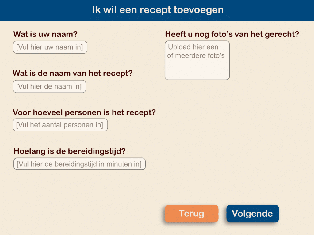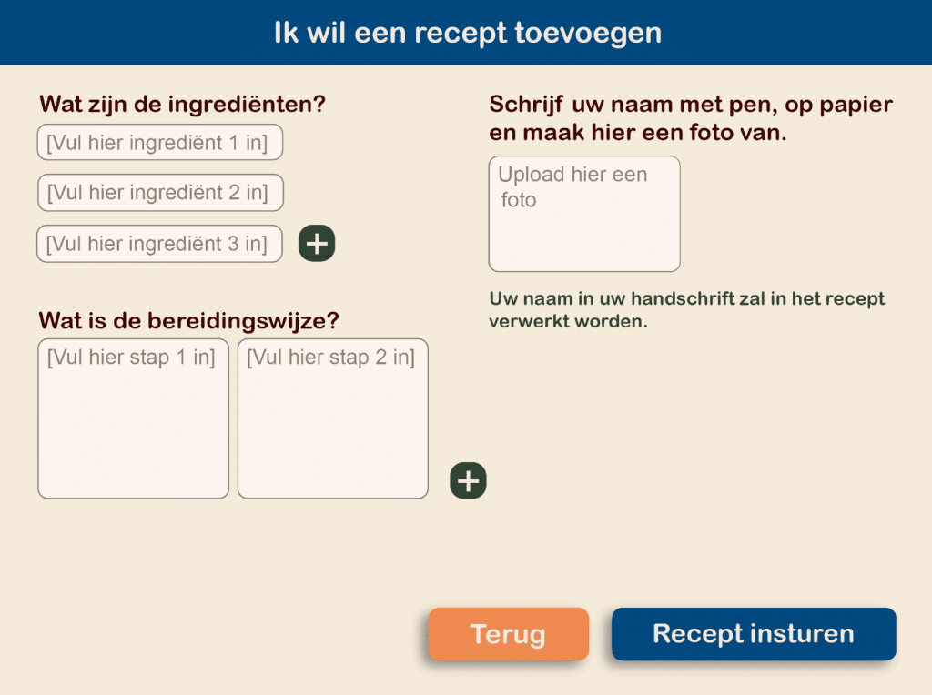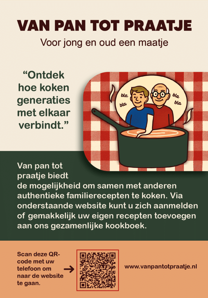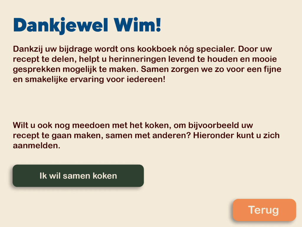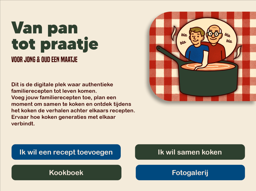 De opdracht van de opdrachtgever van dit zorgpark was om mensen uit sociale instellingen fysiek en mentaal dichter bij elkaar te brengen. Om deze verbinding te stimuleren hebben we als groep een online kookboek ontwikkeld. Via een website kan de doelgroep (ouderen) een eigen (familie)recept toevoegen. Ook kunnen ze zich hier aanmelden voor ontmoetingsmomenten waarop de gerechten gemaakt kunnen worden.