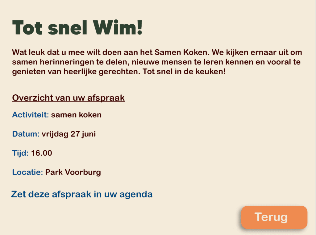 Van pan tot praatje is een (high fidelity) proof of concept dat het resultaat is van een groepsproject voor Park Voorburg in Vught. Eerst heb ik grondig onderzoek gedaan, dat zie je in mijn project Park Voorburg.